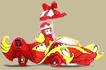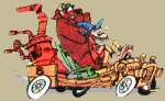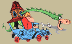 Logo atrás dela os Irmãos Rocha no seu Carro de Pedra: